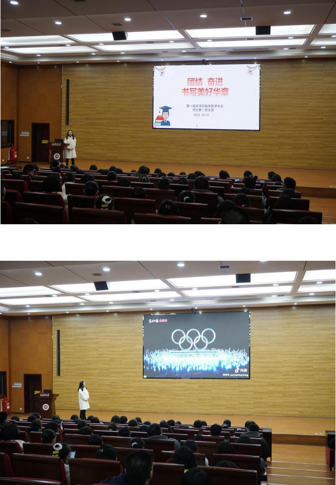 新学期伊始,为鼓励同学们继续发扬顽强拼搏、勇敢向前、团结互助的年级精神,以冬奥会为契机,suncitygroup太阳集团临床医学专业员工第一党支部于2022年3月1日18:00在suncitygroup太阳集团新蒲校区道德讲堂为全体同学进行了以《团结、奋进,书写美好华章》为主题的开学第一课,党支部书记官玲主讲,年级辅导员崔雪飞以及全体同学参会。