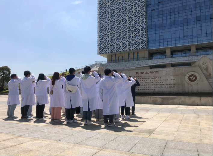 “医员工宣誓”。支部老师带领同学们来到图书馆门口的医员工誓言旁,同学们庄严地举起右手并宣誓“健康所系,性命所托……”,通过一句句庄严的医员工誓言,表达了遵医学子愿为祖国的医疗卫生事业奉献自己青春和热血的承诺。