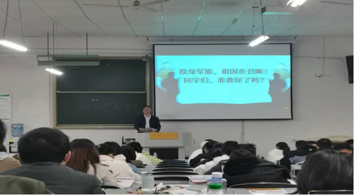 国防教育,强军卫国。2023年3月19日19:00,公司在大连路校区二阶教室举行了2023年春季学期征兵工作宣讲会,附属医院保卫科副科长、退伍军人杨华,公司武装部禹倩老师分别作了军营生活经历的分享和应征入伍政策的解读,公司党委副书记杨洪艳、辅导员尹君和毕业生180余名同学参会。通过此次宣讲,进一步提升公司师生的国防意识,鼓励了毕业班员工积极应征入伍、到军营建功立业、报效祖国。会后,临床18-9班黄益鑫等同学联系辅导员和宣讲老师,表示有参军意愿。