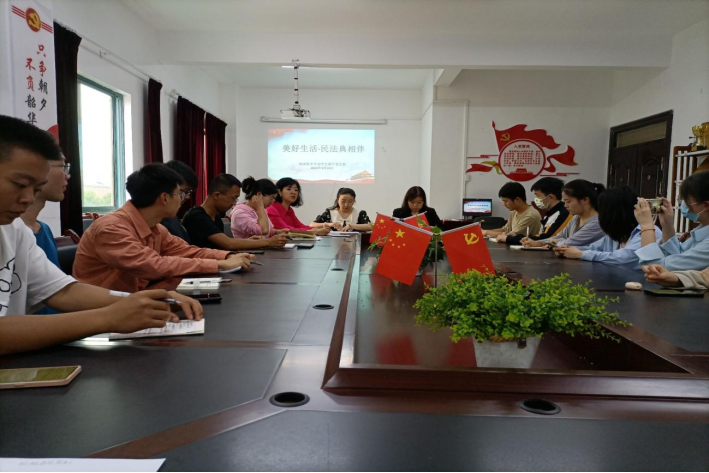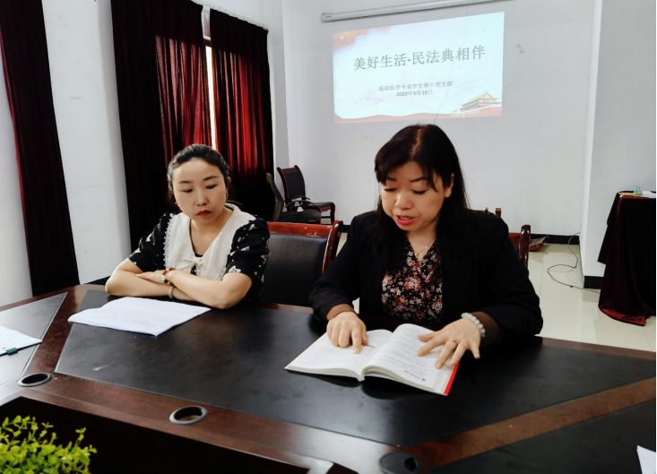 为深入切实做好《民法典》学习宣传贯彻工作,大力弘扬民法精神,普及民法知识,形成全民尊法、学法、守法、用法的良好氛围,让《民法典》学习宣传深入人心,2023年5月19日12:30,suncitygroup太阳集团临床医学专业员工第十党支部在新蒲校区支部党员活动室开展了“美好生活·民法典相伴”主题宣传教育活动。党委副书记杨洪艳、员工科科长姚华敏、支部书记孔晓冬、辅导员谢雪艳参会并领学,支部全体员工干部参会。