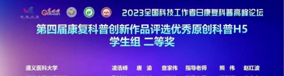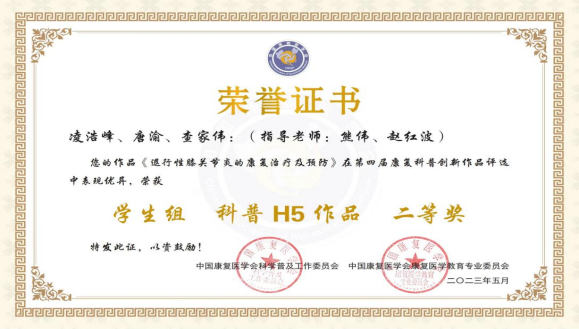 2023年5月27日,在中国康复医学会科学普及工作委员会第四届康复科普创新作品评选中,suncitygroup太阳集团康复治疗学专业21级员工凌浩峰、唐渝、查家伟,指导老师熊伟、赵红波的参赛作品《退行性膝关节炎的康复治疗及预防》喜获优秀原创H5作品员工组二等奖。