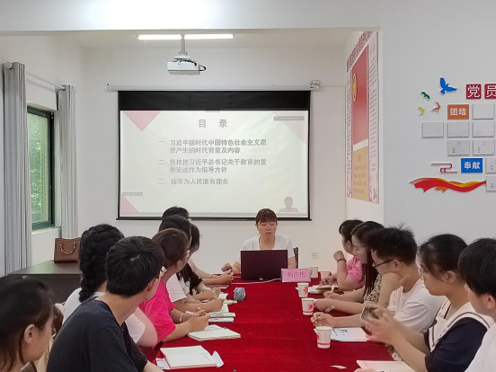 杨洪艳分别从“习近平新时代中国特色社会主义思想产生的时代背景及内容、坚持把习近平总书记关于教育的重要论述作为指导方针、铸牢为人民服务理念”三个方面展开讲述。她详细讲解了习近平新时代中国特色社会主义思想诞生的国际、国内背景,重点领学习近平总书记关于教育的重要论述的核心观点,强调牢记我国教育改革发展的“九个坚持”,引导全体党员做社会主义核心价值观的坚定信仰者、积极传播者、模范践行者。