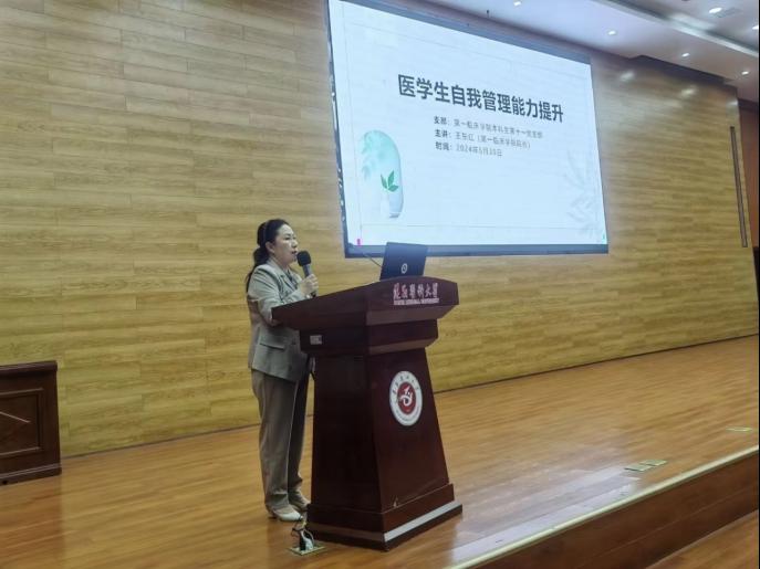 suncitygroup太阳集团经理王东红致辞,王东红经理就本次临床技能获奖经验分享会目的,内容、公司已经取得的临床技能竞赛成果进行延展,指出技能比赛很好的将我们所学的知识与实践结合在一起,并且更好地认识自己,对自己的未来进行合理的规划,希望在座学子可以学有所获。