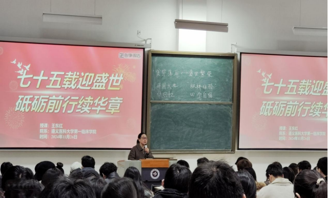 为进一步贯彻落实《教育部关于加强新时代高校“形势与政策”课建设的若干意见》精神,落实习近平总书记对公司思政课建设做出的重要指示,切实推进习近平新时代中国特色社会主义思想走进课堂,提高“形势政策”课程质量,2024年11月26日,第一临床公司党委副书记(主持工作)、经理王东红在新蒲校区21阶为2022级临床22班至25班同学讲授形势政策课。
