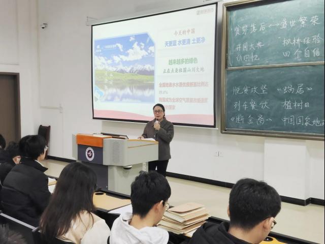 以《七十五载迎盛世,砥砺前行续华章》为题,王东红从“经济持续健康发展、民主之路越走越宽、文化发展更加繁荣、人民生活极大改善、美丽中国焕发新颜”五个部分带领同学们深入了解了新中国成立七十五年来日新月异的变化发展。她以经济发展为始,展示了新中国成立以来,从贫穷落后到成为世界第二大经济体的巨大飞跃;以民主制度体系、文化发展现状、人民生活质量为线,详细介绍了新中国在政治政策与经济建设上的探索与成就;最后以新时代中国新建设、新面貌为尾,阐释了新中国在不断发展的同时坚持绿水青山就是金山银山的精神,展现中国对环境保护的高度重视与坚定决心。