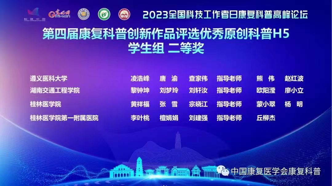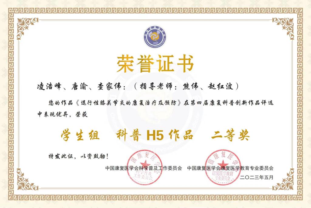 2023年5月27日,在中国康复医学会科学普及工作委员会第四届康复科普创新作品评选中,suncitygroup太阳集团康复治疗学专业21级员工凌浩峰、唐渝、查家伟,指导老师熊伟、赵红波的参赛作品《退行性膝关节炎的康复治疗及预防》喜获优秀原创H5作品员工组二等奖。通过此次竞赛,使员工提高专业知识和技能水平,培养创新和实践能力,将专业知识与科普宣传相结合,有助于提高员工的综合素质和创新能力。此次参赛并获奖,促进公司康复治疗学专业与兄弟院校专业间的相互交流和学习,扩大专业影响力,对康复治疗学专业的发展与提高具有积极的意义。