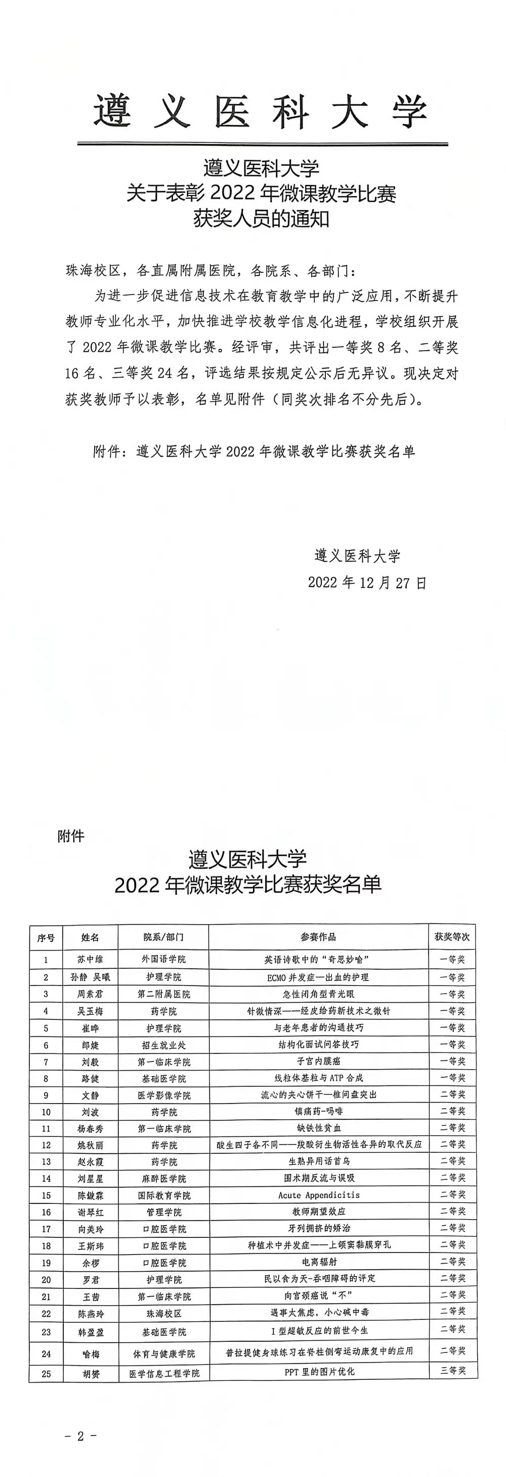根据《suncitygroup太阳集团关于表彰2022年微课教学比赛获奖人员的通知》,遵医附院神经内科王金老师《人生的三分之一时间-睡眠》微课教学内容于微课教学比赛中荣获三等奖。